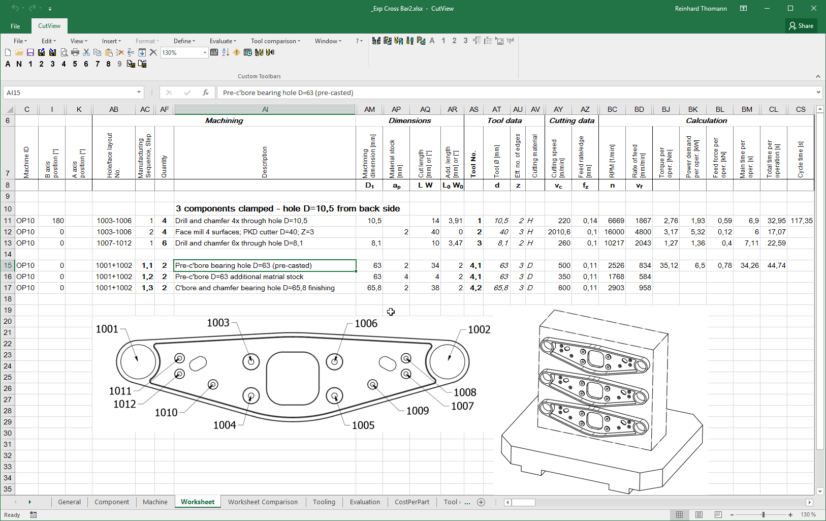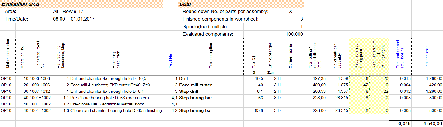To calculate the manufacturing costs CutView offers a detailed identification of the tool costs. The standard size of the tools is extrapolated to calculate the requirements and costs for a production volume. This facilitates tool scheduling and allows the user to identify cost drivers, thus allowing him to optimise e.g. by using a different cutting material.
