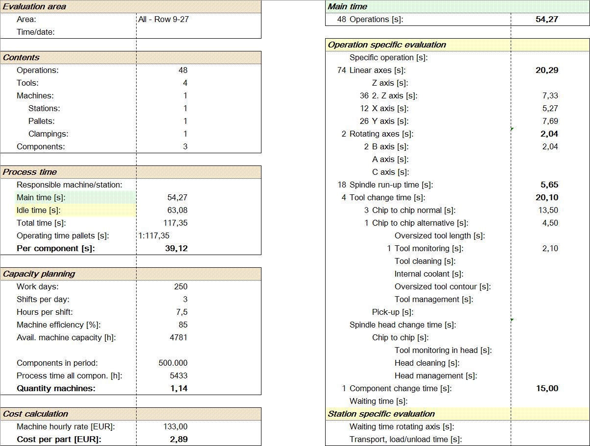 The workplan shows a detailed list of all machining steps in the correct sequence. The orientation in the machine is described for every operation step e.g. rotary table position(s). In addition to the machining time, the result also indicates performance, torque and feed force. If speed limitations are exceeded, they are shown in red and the available machine data are indicated.